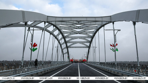 Кіраўнік дзяржавы ва ўрачыстай абстаноўцы перарэзаў сімвалічную чырвоную стужку. На цырымонію былі запрошаны прадстаўнікі працоўных калектываў дарожных арганізацый, якія ўдзельнічалі ў будаўніцтве моста, жыхары Мазырскага раёна. Па існуючай традыцыі да Дня Кастрычніцкай рэвалюцыі людзям падносяць падарункі - значныя, маштабныя аб'екты, і абноўлены мост - адзін з іх.