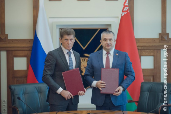Губернатору Приморского края был вручен юбилейный знак "80-летие освобождения Гомельской области". Представители Приморья приняли предложение и подтвердили участие в экономическом форуме в Гомеле в сентябре.