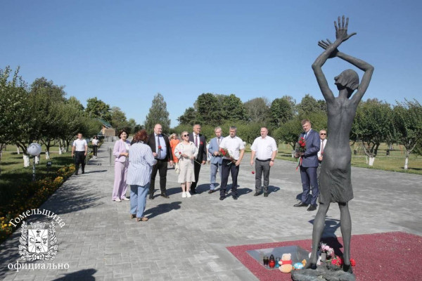 Гостей встречал председатель Жлобинского районного исполнительного комитета Сергей Ярец. Сергей Борисович рассказал о масштабной реконструкции, которая сейчас проводится на мемориале, новым объектом которого станет возводимый здесь музей «Детям – жертвам войн».