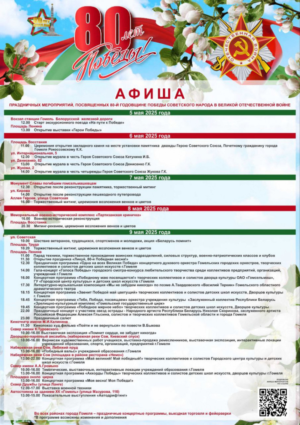 В Гомеле состоятся мероприятия, посвященные 80-й годовщине Победы советского народа в Великой Отечественной войне и Дню Государственного флага, Государственного герба и Государственного гимна Республики Беларусь.