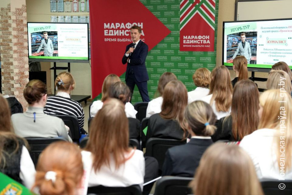 Встреча состоялась в рамках республиканской общественно-культурной акции «Марафон единства». В качестве спикеров выступили заместитель министра образования Беларуси Екатерина Петруцкая и политический обозреватель телеканала ОНТ Игорь Тур.